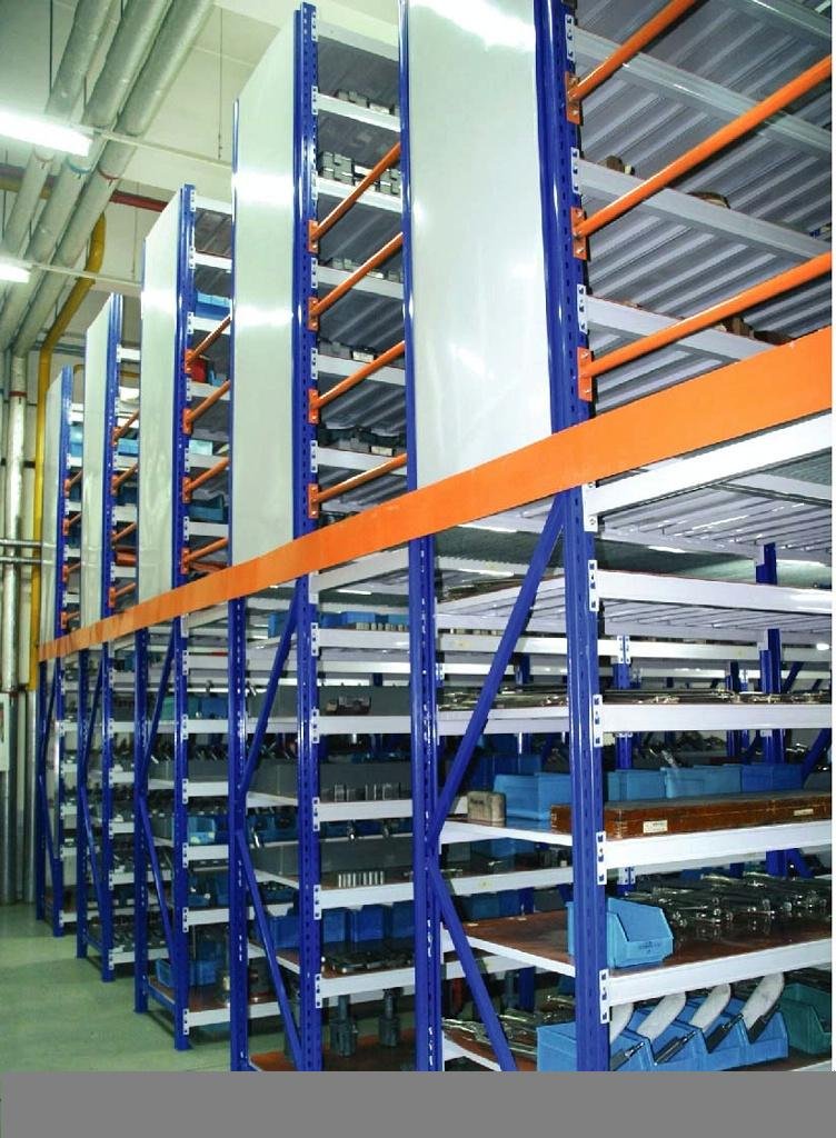 | 阁楼货架的结构 阁楼货架系统,通常利用中型搁板式货架或重型搁板式货架作为主体支撑加上楼面板(根据货架单元的总负载重量来决定选用何种货架),楼面板通常选用冷轧型钢楼板、花纹钢楼板或钢格栅楼板。近几年多使用冷轧型钢楼板,它具有承载能力强、整体性好、承载均匀性好、精度高、表面平整、易锁定等优势.有多种类型可选,并且易匹配照明系统,存取、管理均较为方便。单元货架每层载重量通常在500kg以内,楼层间距通常为2.2m~2.7m,顶层货架高度一般为2m左右,充分考虑工作人员操作的便利性。